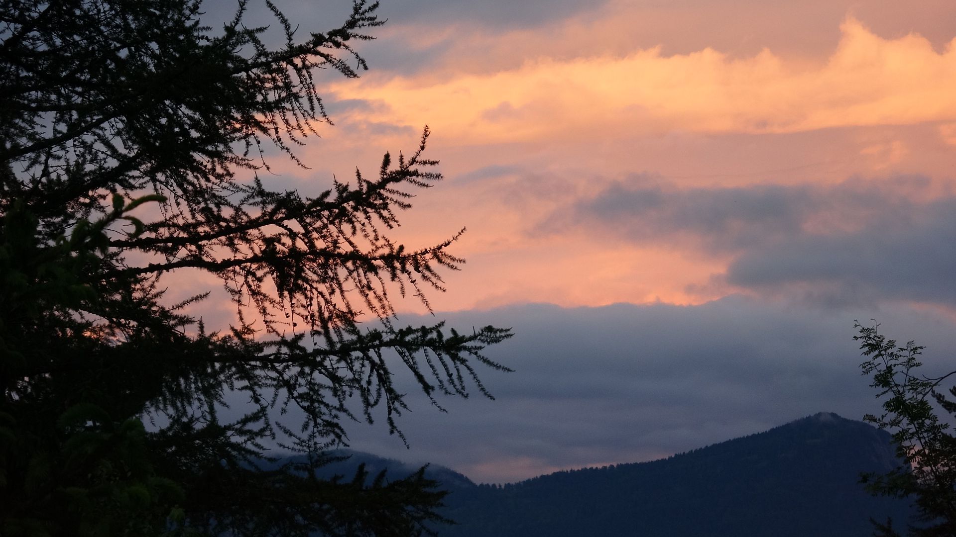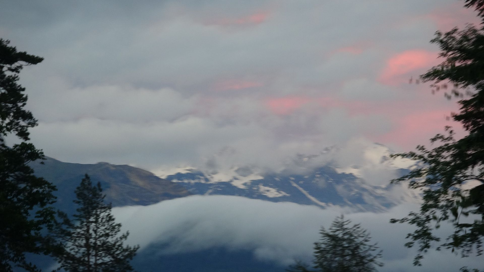 Là, les montagnes ressortent imposantes. Ses sommets enneigés s'élèvent vers le ciel, contrastant avec le vert intense de la forêt. La neige recouvre les pentes, formant une couverture blanche qui semble inchangée même au soleil.